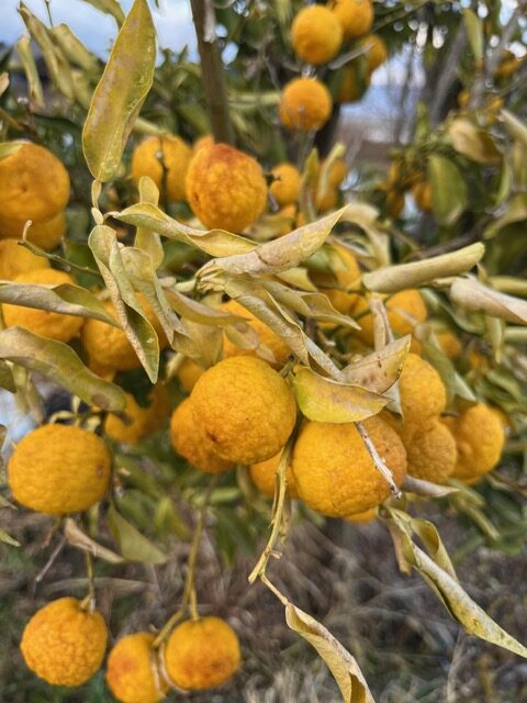 隣人の庭では、柚子の挑戦的な黄色が枝にしがみついている。